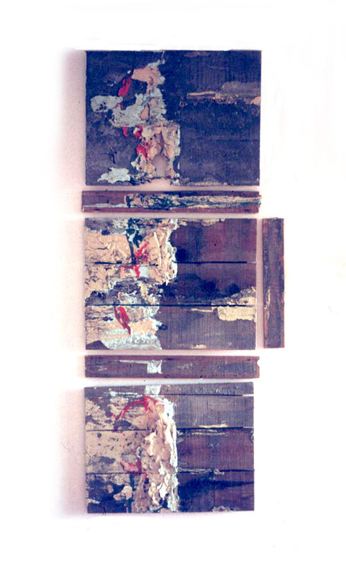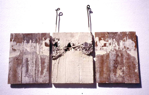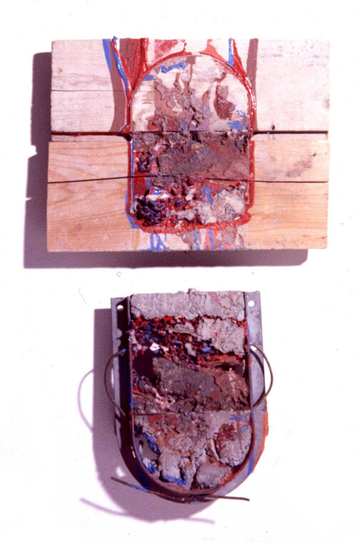 Coffrage en bois, béton, fer, tissu noir, peintures